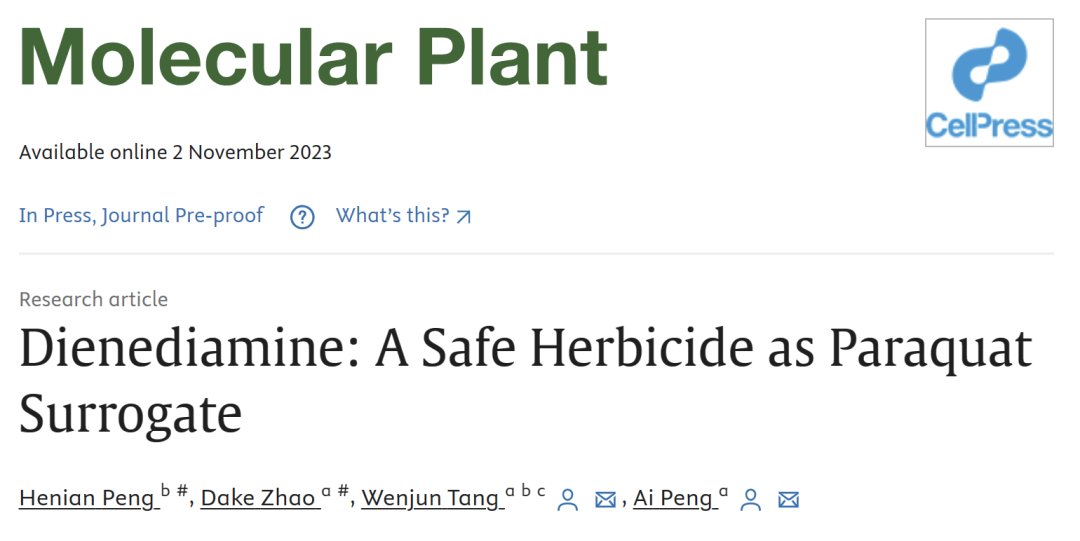 2023年11月2日, Molecular Plant 在線發表了同濟大學附屬第十人民醫院彭艾教授和中國科學院上海有機化學研究所湯文軍研究員共同合作的研究論文“Dienediamine: A Safe Herbicide as Paraquat Surrogate”。研究團隊創制的Dienediamine(雙烯雙胺)不僅在一系列小鼠和細胞實驗中表現出安全無毒,而且呈現出和百草枯相當的除草效果,有望成為一種替代百草枯、安全無毒的新型綠色農藥。