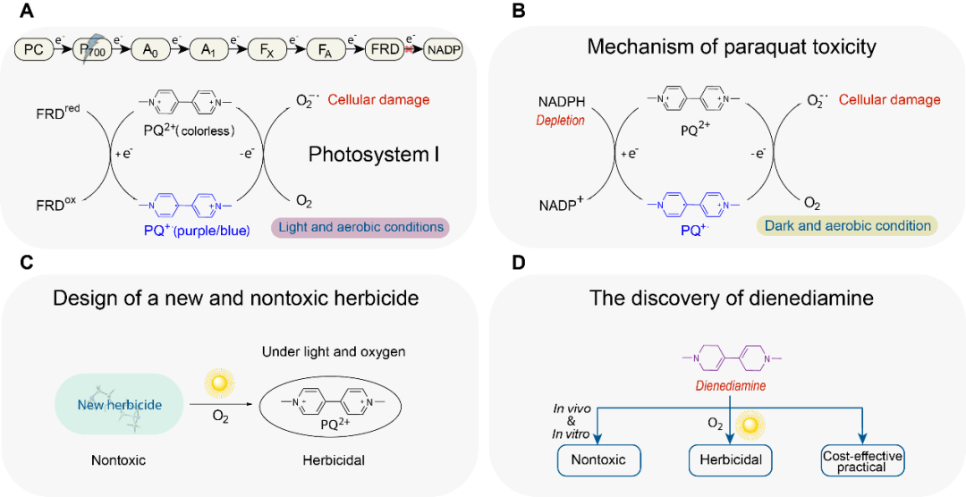 由于百草枯的除草性能和毒性均源于其聯吡啶鹽結構的電子傳導功能,因此要保持其結構的除草性能卻消除其毒性極其困難。研究團隊基于植物除草和人畜體內的作用環境不同,提出一種本身沒有電子傳導功能,但在除草環境中能轉化為聯吡啶鹽結構的百草枯前體有望成為一種安全無毒的除草劑(圖1)。基于百草枯的除草和毒性機制,一個容易制備的“還原態”百草枯前體-雙烯雙胺成為了研究目標。