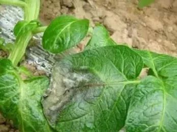 發病嚴重時,使葉片萎蔫下垂,全株變黑呈濕腐狀。天氣干旱時,病斑干枯呈褐色,葉片背面無白色霉層,病葉脆易破裂,病害擴展緩慢。